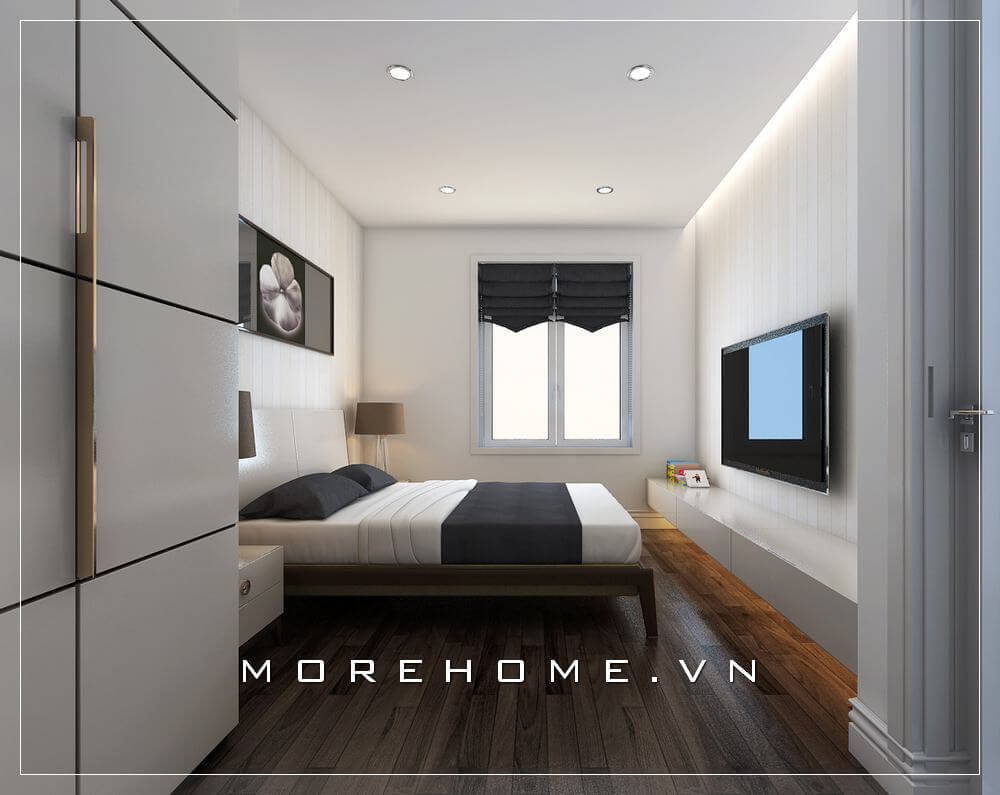 Nội thất phòng ngủ chung cư màu trắng tinh tế, sàn gỗ màu nâu trầm ấn tượng được lựa chọn tạo nên cho căn phòng thêm phần sang trọng và hiện đại hơn cả