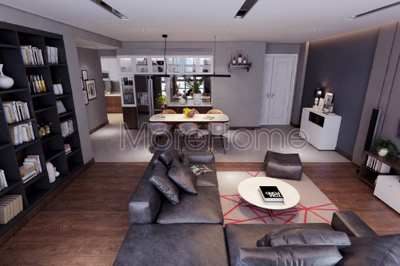 Phòng khách liên kết trực tiếp với khu vực ăn uống, tạo không gian mở và sự thông thoáng cho căn chung cư