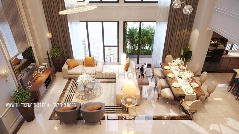 Thiết kế nội thất phòng ăn liền kề với không gian tiếp khách giúp cho gia chủ thuận tiện hơn trong việc tiếp khách đến chơi nhà những bữa ăn ngon miệng