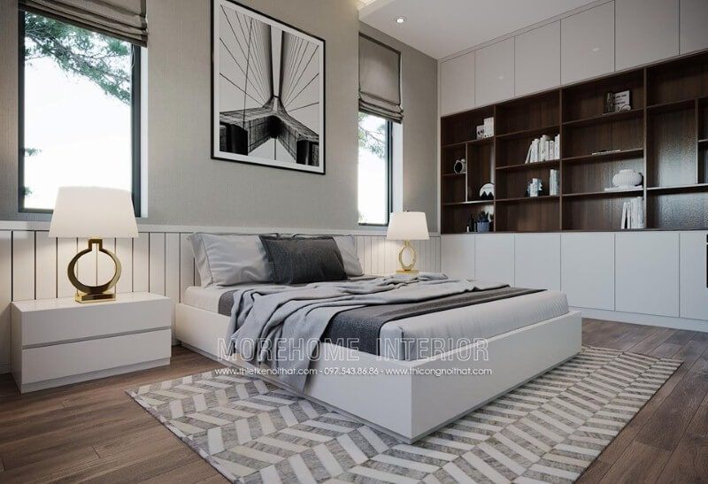 Tone màu chủ đạo của căn phòng ngủ là trắng và xám thích hợp cho phòng ngủ mang phong cách tân cổ điển sang trọng.