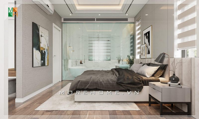 vách kính ngăn cách giữa phòng ngủ với nhà tắm, thiết kế thông minh sáng tạo biến căn phòng ngủ trở nên tiện nghi.