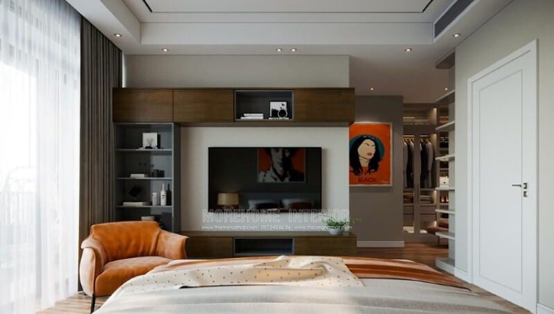 Cửa kính lớn cùng rèm 2 lớp giúp không gian luôn thông thoáng bên cạnh đó, đồ nội thất hiện đại sang trọng càng làm tăng thêm sự sang trọng, đẳng cấp cho phòng ngủ master.