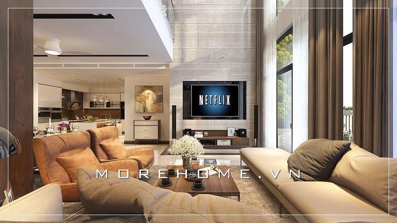Đồ nội thất gỗ óc chó chủ đạo từ sofa, bàn trà, bàn trang trí, kệ tivi, cửa từ phong cách tân cổ điển đã tạo nên vẻ đẹp sang trọng, ấn tượng cho không gian phòng khách lựa chọn ấn tượng cho biệt thự, nhà phố.