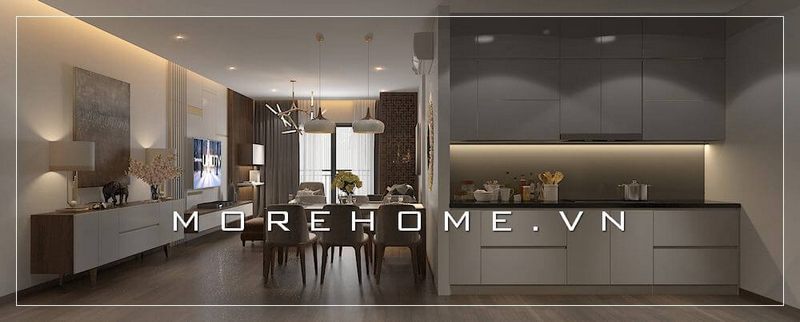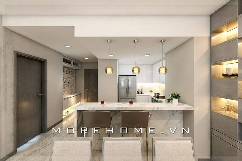 Các kiến trúc sư MoreHome giới thiệu mẫu thiết kế nội thất phòng bếp liền phòng khách cho chung cư có hệ thống tủ bếp chia nhiều ngăn để đồ và quầy bar trẻ trung kết hợp làm bàn ăn