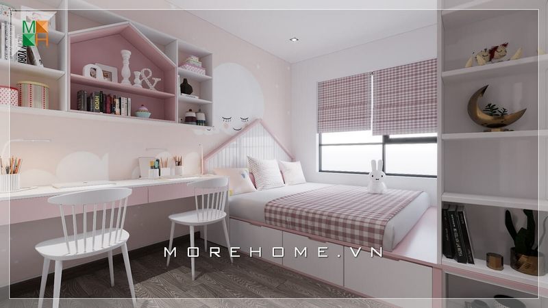 Nội thất phòng ngủ con gái được bố trí khoa học, gam màu hồng - trắng chủ đạo mang lại cảm giác cho không gian thêm phần tinh tế và rộng rãi hơn