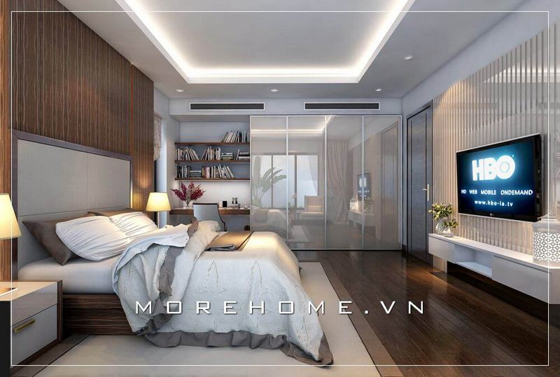 Mẫu thiết kế phòng ngủ chung cư hiện đại, tủ quần áo gỗ được phủ bóng gương kịch trần, kệ ti vi treo tường gỗ công nghiệp...tạo hiệu ứng cho không gian thêm rộng và cao hơn