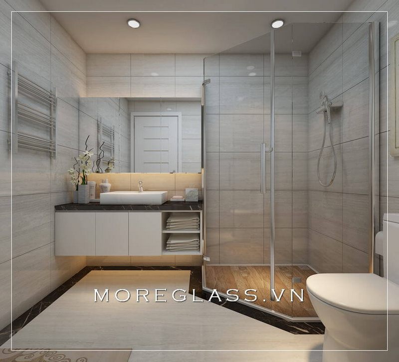 Mẫu thiết kế phòng tắm đẹp của chúng tôi sử dụng gạch ốp lát màu trắng sáng để kết hợp với nội thất nhỏ gọn và tiện lợi, tạo nên một căn phòng đầy đủ tiện nghi và thông thoáng.