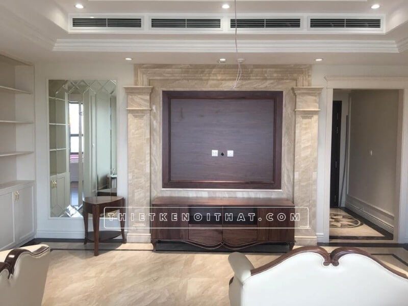 Công trình thi công ốp vách tivi từ đá tự nhiên cho nhà chung cư Dcapital Trần Duy Hưng ở Cầu Giấy, Hà Nội, mang phong cách cổ điển.