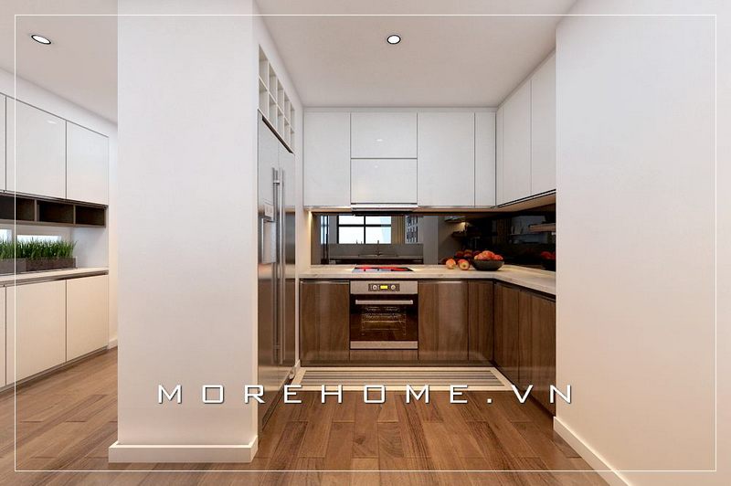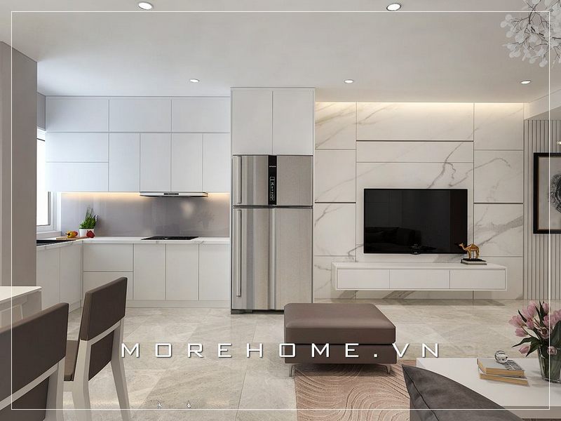 Tone màu trắng hiện đại và trẻ trung được sử dụng để thiết kế nội thất phòng bếp của căn hộ chung cư để tạo ra sự đẹp và trẻ trung.