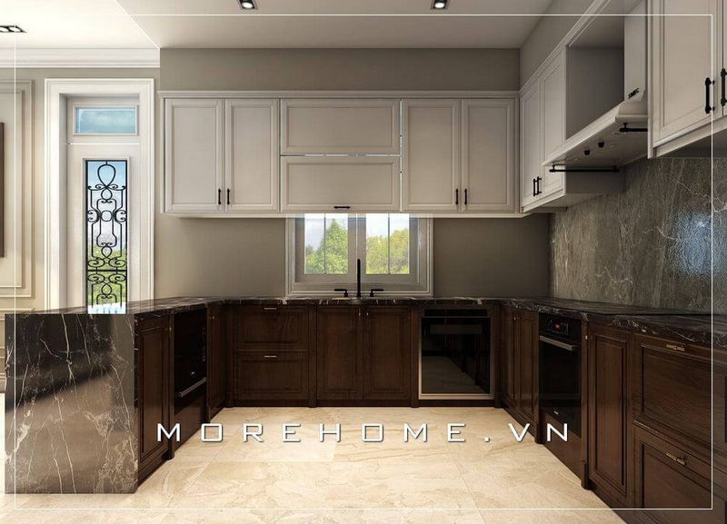 Mẫu tủ bếp biệt thự hiện đại có thiết kế bằng gỗ tự nhiên và mặt bếp ốp đá màu đen vân mây, giúp tạo nên không gian phòng bếp sạch sẽ và tinh tế.