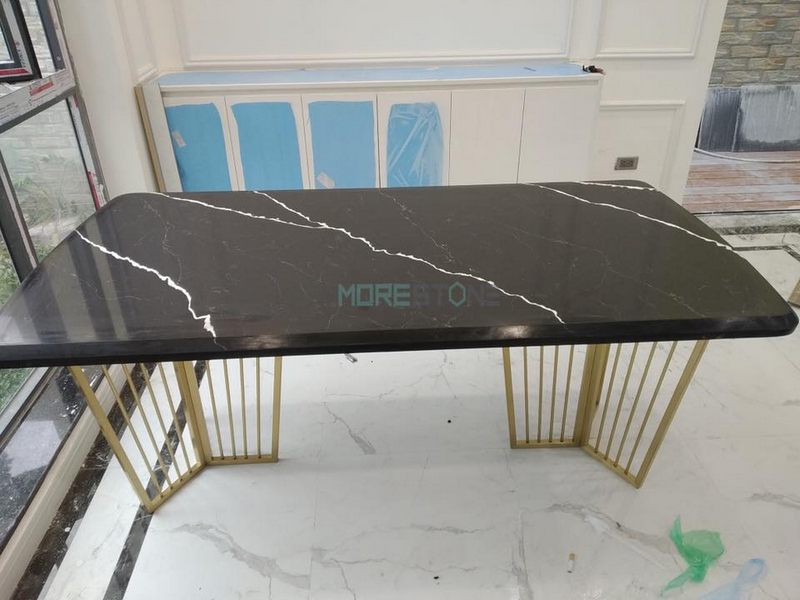 Đá tự nhiên có màu đen sang trọng khiến cảm giác ấn tượng hơn khi được bố trí làm mặt bàn lớn với những đường vân tinh tế, kết hợp giữa sang trọng và khỏe khoắn.
