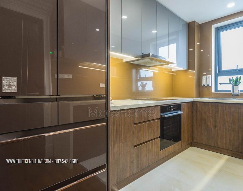 Kính ốp bếp màu vàng nâu sẽ làm nổi bật phong cách của phòng bếp và giúp nó trở nên sâu hơn.