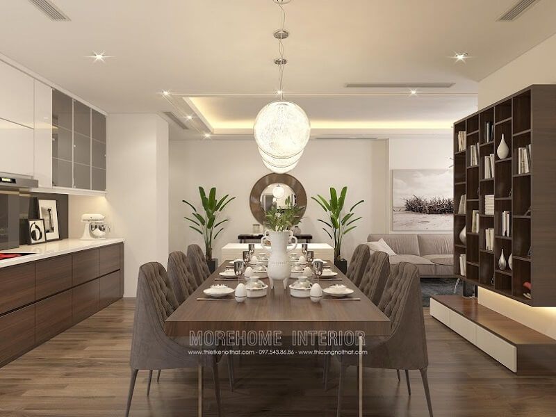 KTS Morehome đã sáng tạo ra một phương án để tận dụng khoảng không gian trống giữa phòng khách và lối vào bằng cách đặt một bộ bàn ăn. Điều này sẽ giúp không gian trống trải và tạo nên một bố cục ấm áp cho ngôi nhà của bạn.