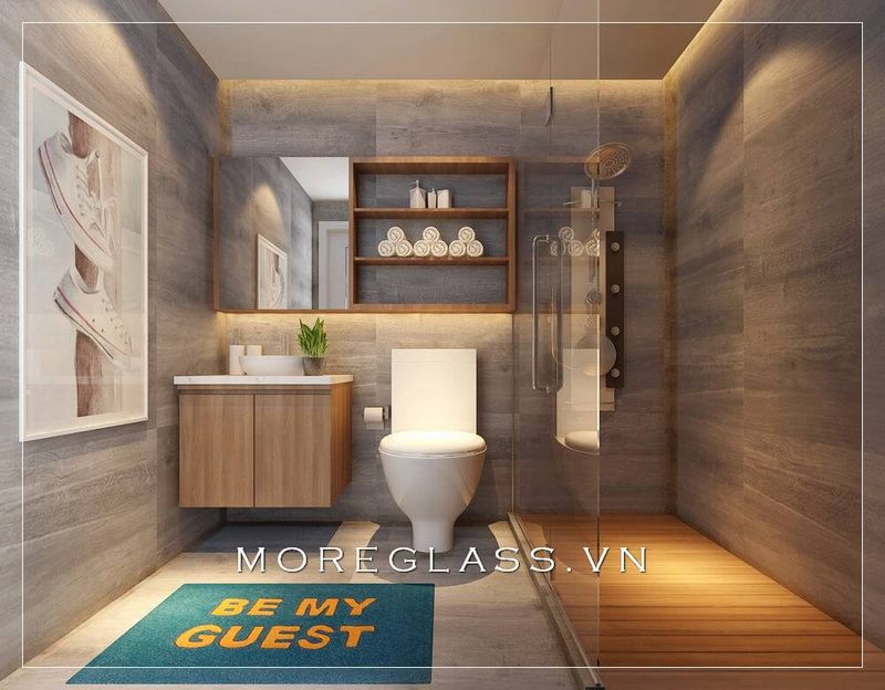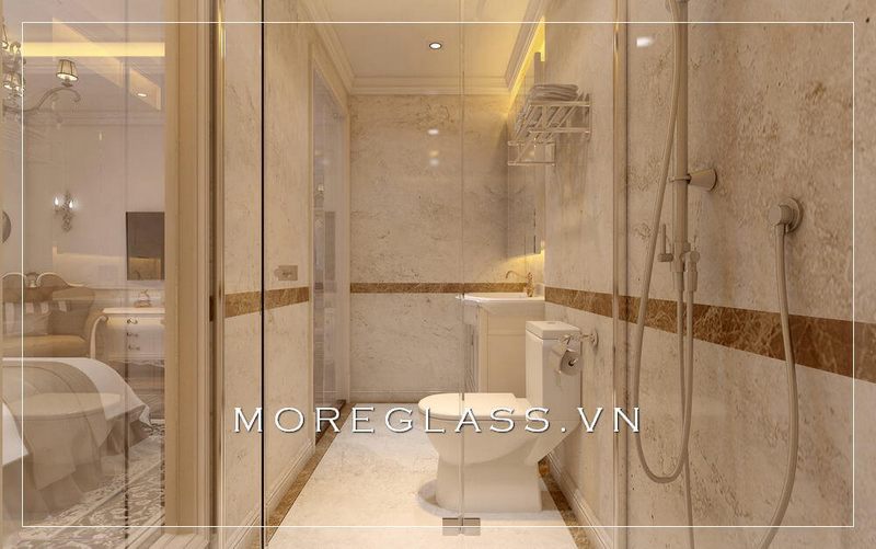 Mẫu thiết kế nhà tắm kính cường lực cao cấp, có kích thước nhỏ gọn và gam màu vàng ấm sẽ góp phần tạo nên cảm giác gần gũi, sang trọng cho căn phòng.