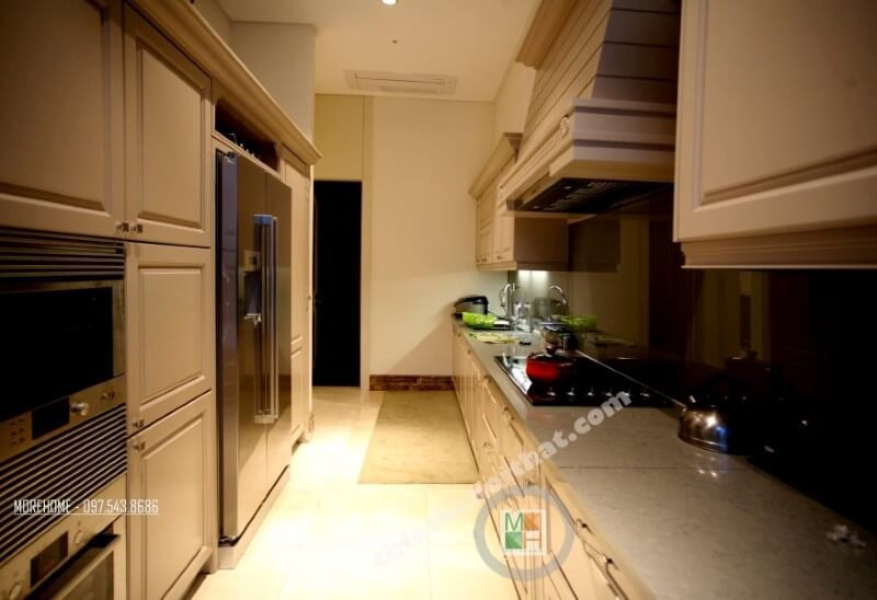 Màu trắng trẻ trung hoàng gia của mẫu tủ bếp tân cổ điển đã khiến căn bếp của biệt thự, nhà phố trở nên cao cấp và rộng rãi hơn.